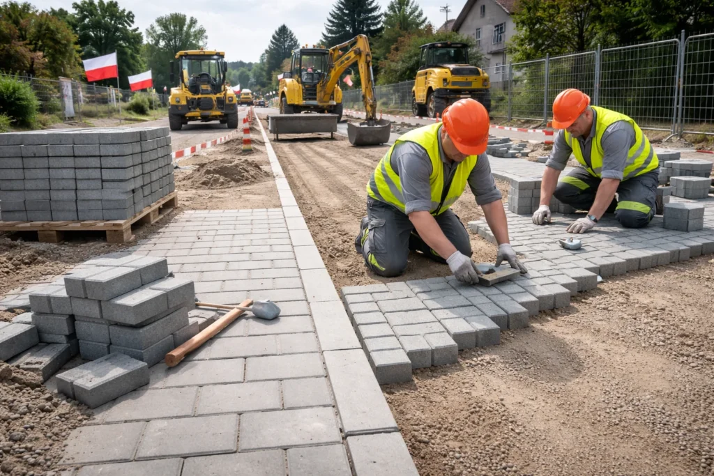 Chodniki, ścieżki pieszo-rowerowe, parkingi, krawężniki, obrzeża, wysepki, zatoki autobusowe, wjazdy